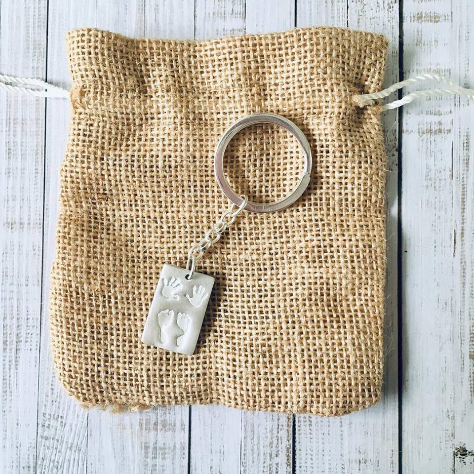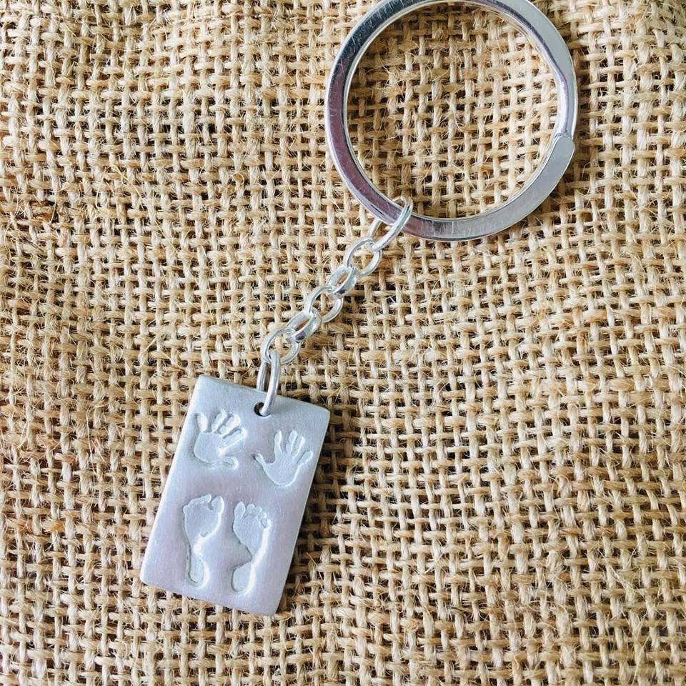 A stunning handmade key chain capturing the unique hand or footprint of your little loved one! Made in 99.9% fine silver and completed with a brushed or high polish finish, the key chain can also be personalised with a name on the front. Made in size medium, they can fit up to four little prints.They are made a luxury 2mm thick to ensure a quality feel. The key chain element is sterling silver consisting of a larger split ring and belcher chain. Both ends are connected with a soldered jump ring.