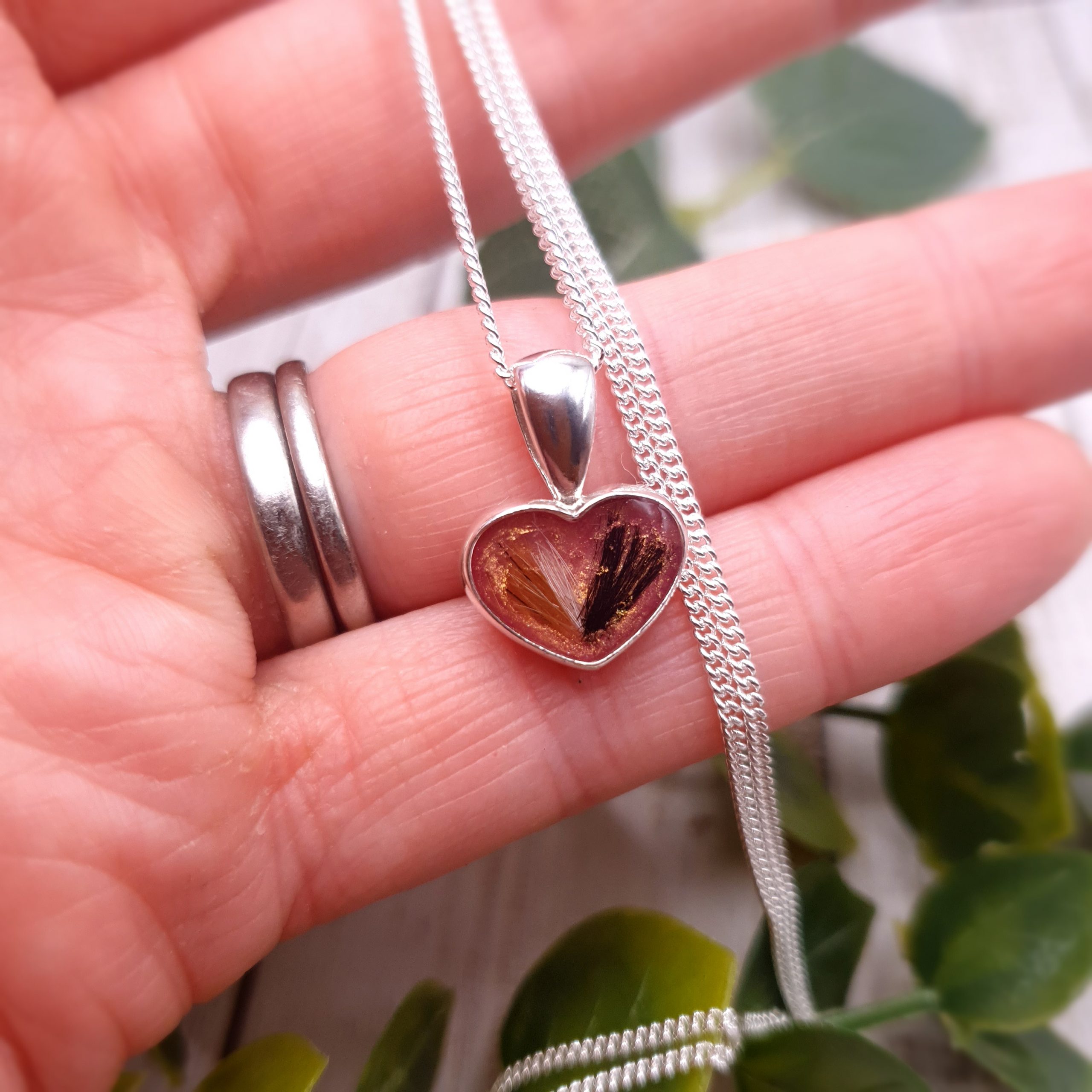 A beautiful, sterling silver pet hair heart necklace charm with your loved one’s hair captured inside. The hair is carefully set in high quality resin. Choose from a choice of colours. These stunning hair in resin heart charms can make a meaningful memorial gift using human or pet hair, or even as a gift for a parent with their child’s first lock. Choose from an optional sterling silver snake chain (45cm), curb chain (50cm) or just the charm by itself.