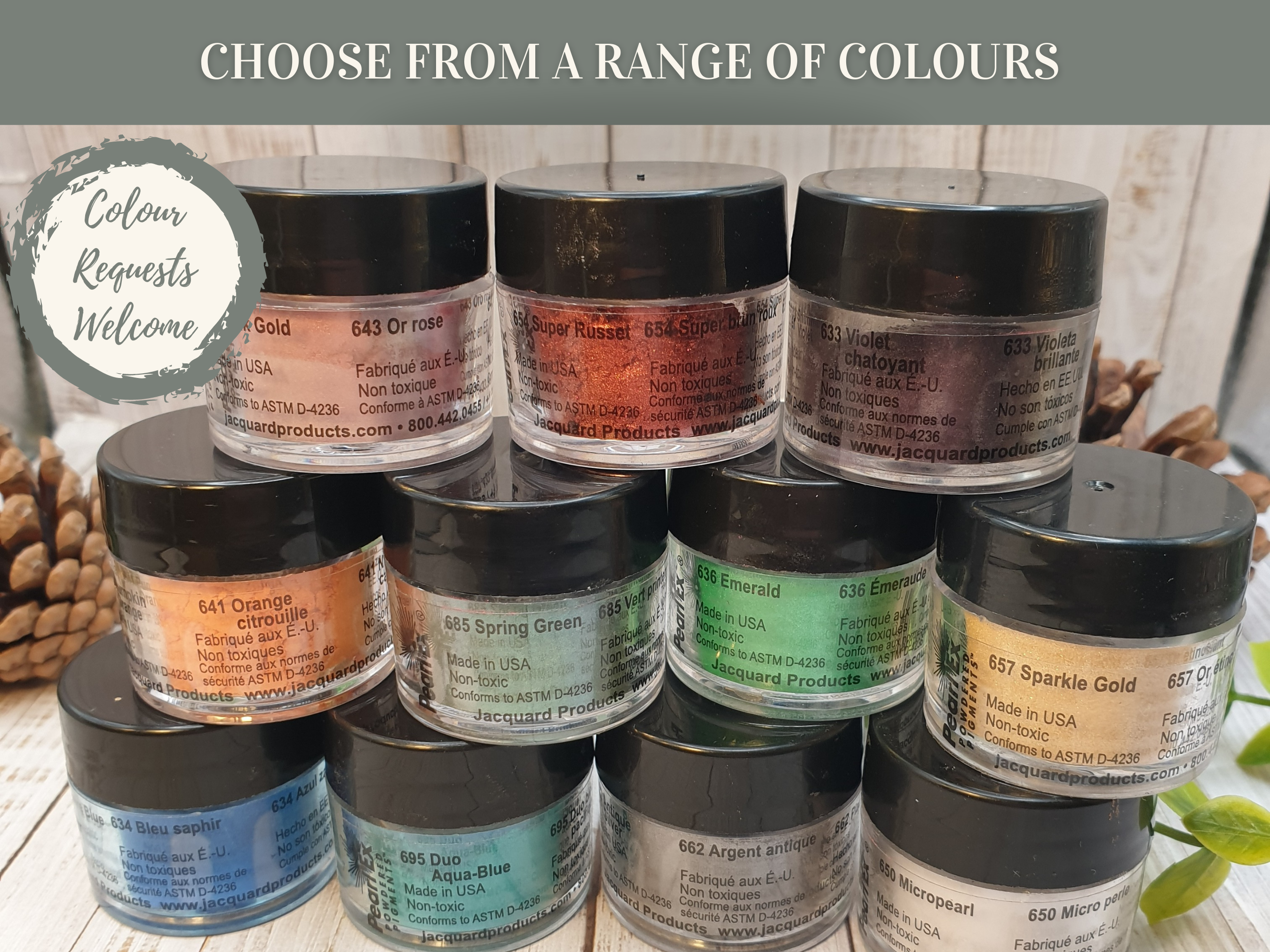 For resin colours, choose from pink gold (pictured), micro pearl, sparkle gold, antique silver, shimmer violet, spring green, emerald, aqua blue, sapphire blue, red, super russet (reddy brown). You can also request another colour that is not listed. Please get in touch.