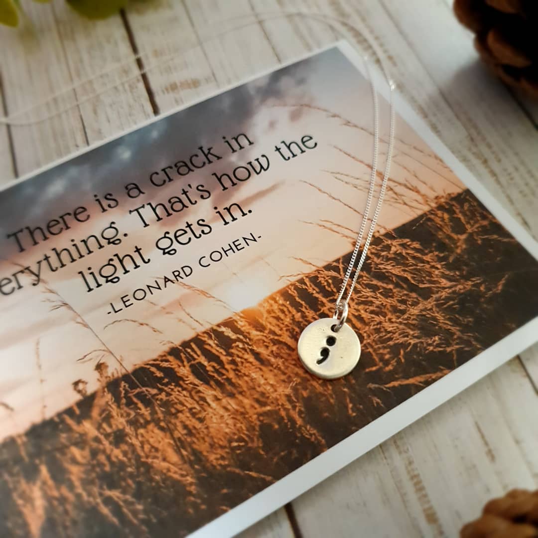 The semicolon sign symbolises solidarity between people dealing with mental health illness or the death of someone from suicide. This semicolon charm has been handcrafted in pure silver and comes attached to a sterling silver fine chain (45cm).